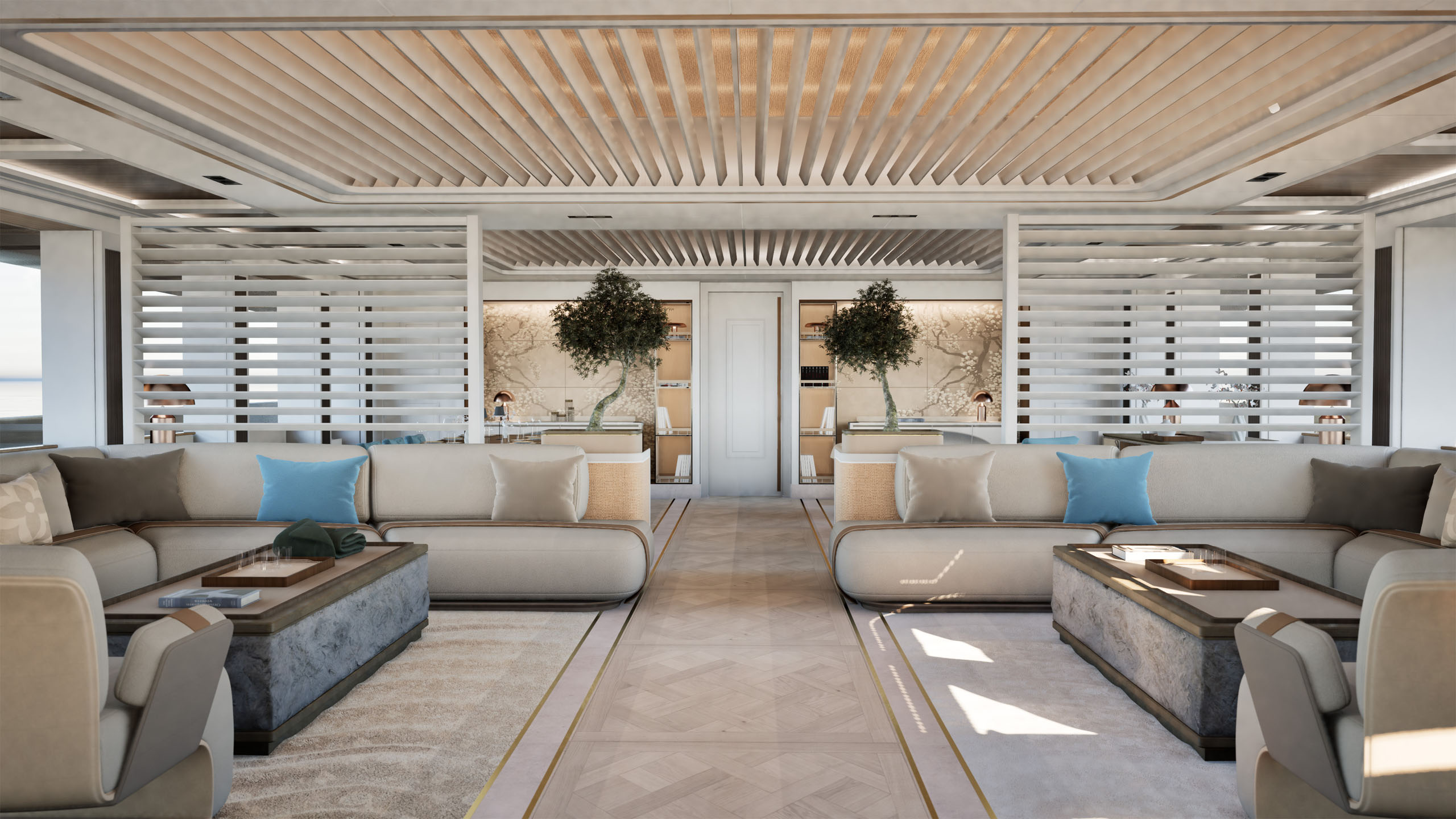 Drawing inspiration from Caribbean summer villas, the interior design explores the duality between raw and refined elements. The Caribbean villa aesthetic—with its generous openings, indoor-outdoor flow, and natural materials like weathered wood, sun-kissed stone, and salt-softened linen—presents a compelling challenge when translated to the maritime world.
