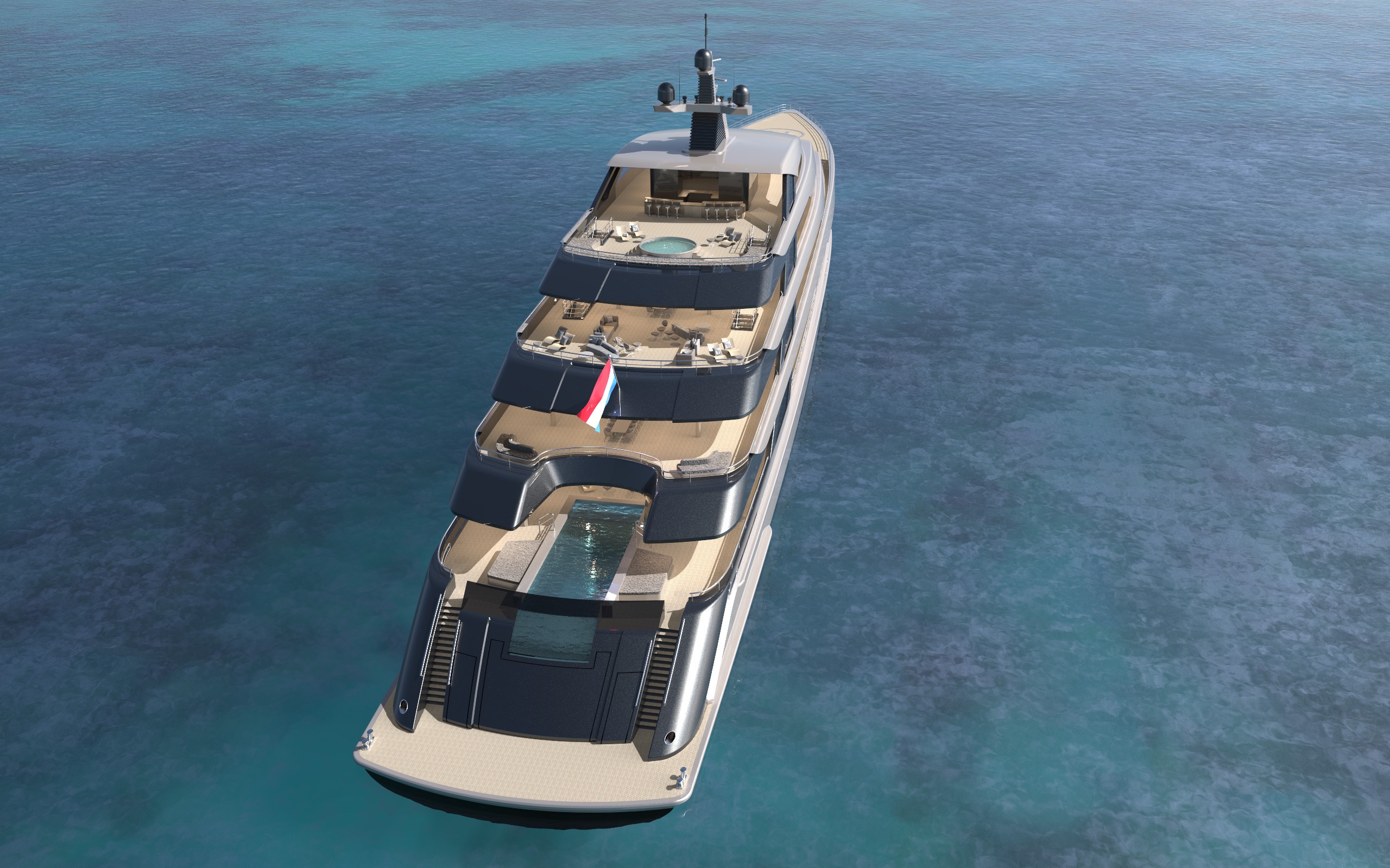 Those initial sketches garnered considerable interest, including from one particular client who asked to see more of the design. “So we started deeper development of the concept and extended that into full 3D renders; we did some basic calculations to centre the concept in reality, and came up with lots of exciting ideas to play with,” Mulder continues. “We didn’t work on a full general arrangement although we did create the block plan to define the spaces needed for guests, crew, accommodation and technical areas; but we wanted to show that far from being just technical designers, we can offer our skills and experience of creating stunning exterior designs at any size of yacht that consider interior demands and thereby perfectly fuse function and form.”