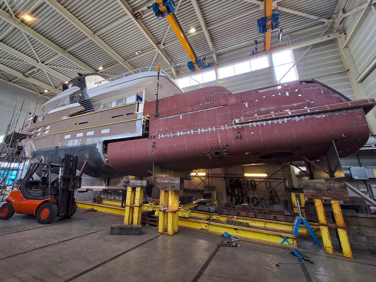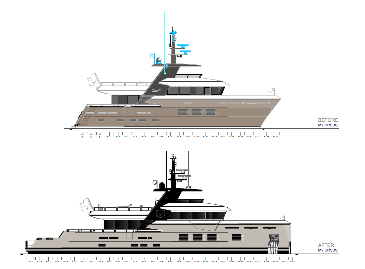 Mulder Design’s refit of the yacht Ursus presented unique engineering challenges: extending the compact 24m vessel to 30m required precise 3D-scanned hull cuts and structural upgrades to meet new class requirements, while relocating equipment like frequency cabinets and a tender crane demanded creative solutions in extremely confined spaces.