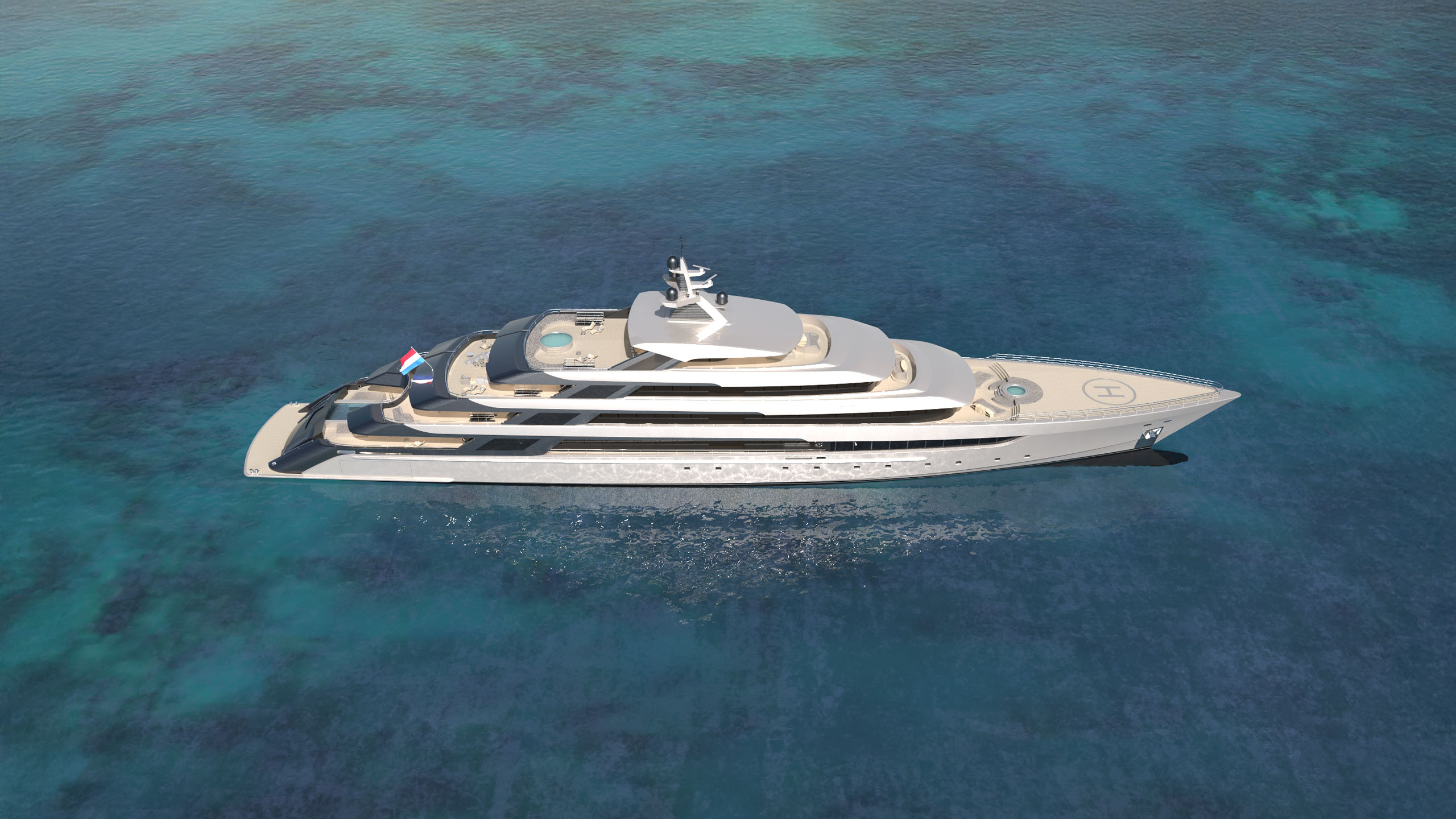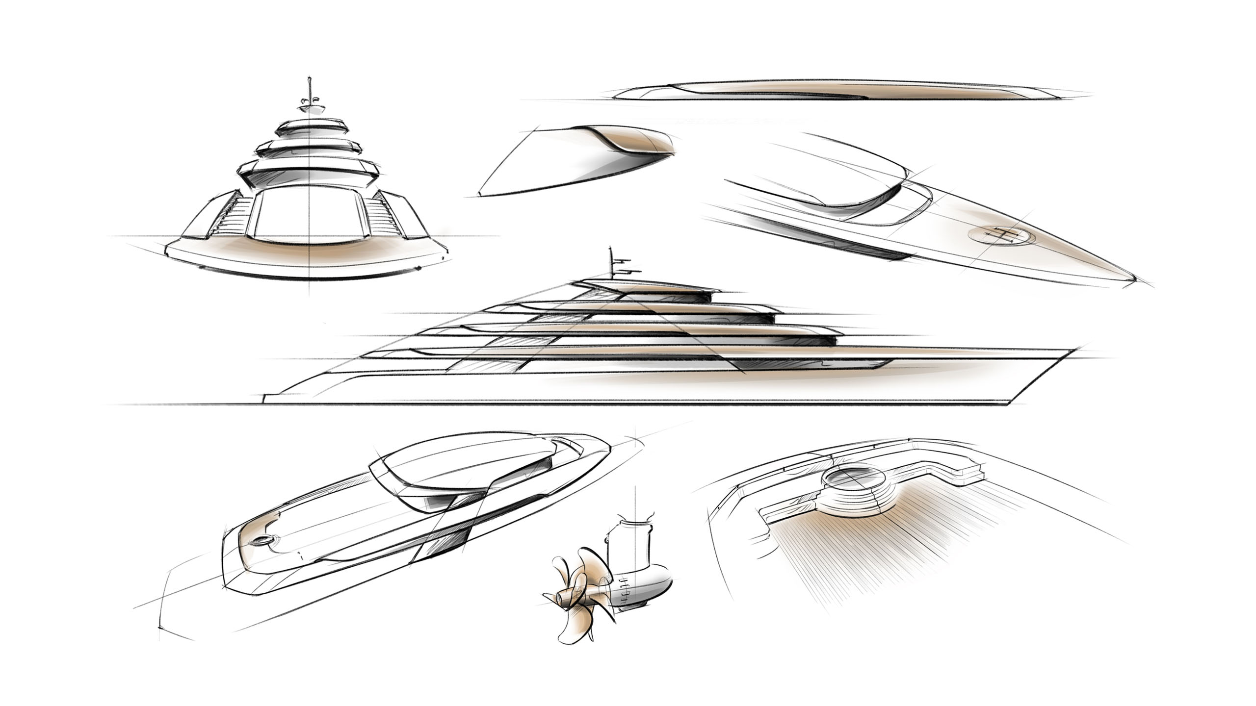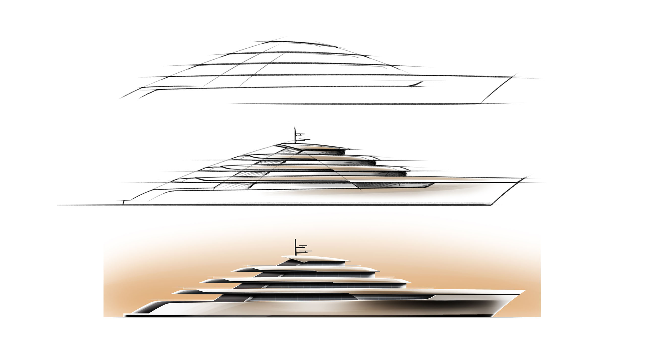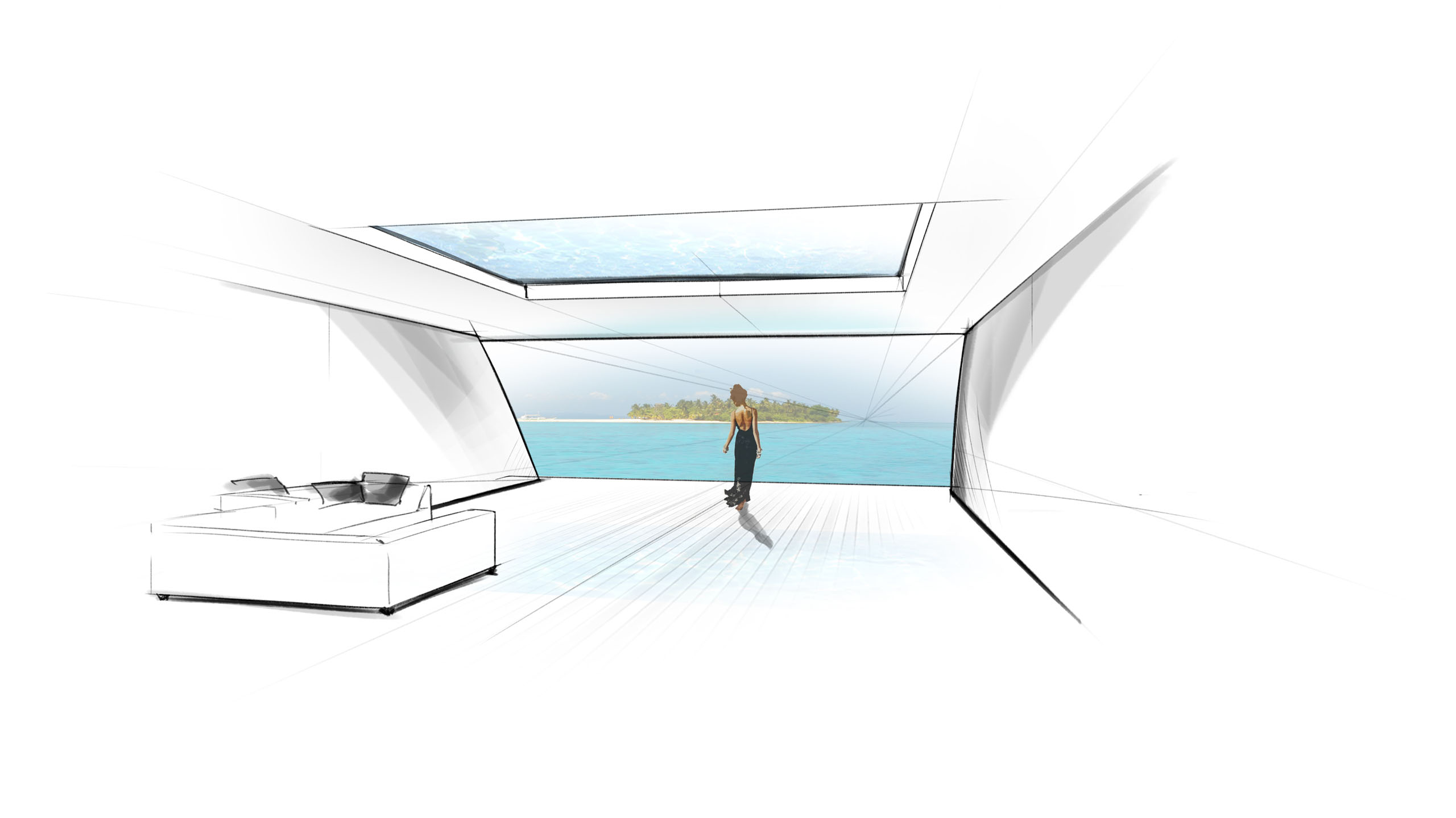 Those initial sketches garnered considerable interest, including from one particular client who asked to see more of the design. “So we started deeper development of the concept and extended that into full 3D renders; we did some basic calculations to centre the concept in reality, and came up with lots of exciting ideas to play with,” Mulder continues. “We didn’t work on a full general arrangement although we did create the block plan to define the spaces needed for guests, crew, accommodation and technical areas; but we wanted to show that far from being just technical designers, we can offer our skills and experience of creating stunning exterior designs at any size of yacht that consider interior demands and thereby perfectly fuse function and form.”