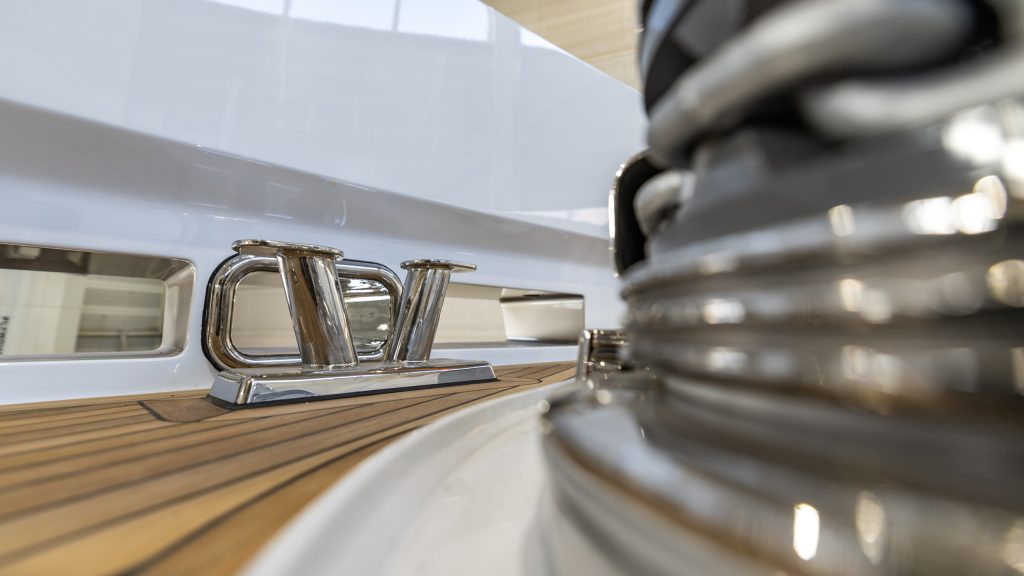 Once the extensive design and engineering process was complete, Ursus underwent a comprehensive rebuild at Balk Shipyard that took some 18 months. The bow and stern were removed and replaced, adding extra space at both ends. The tender garage was relocated, creating a new seating area in the bow, while a twin anchor system and a crew cabin were integrated. Additionally, the decks were upgraded with FSC-certified teak, and the hull was repainted to align with the owner’s latest Range Rover livery Batumi Gold.