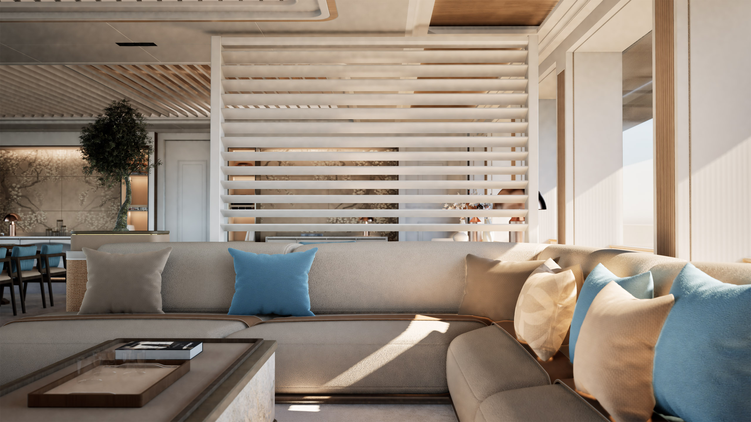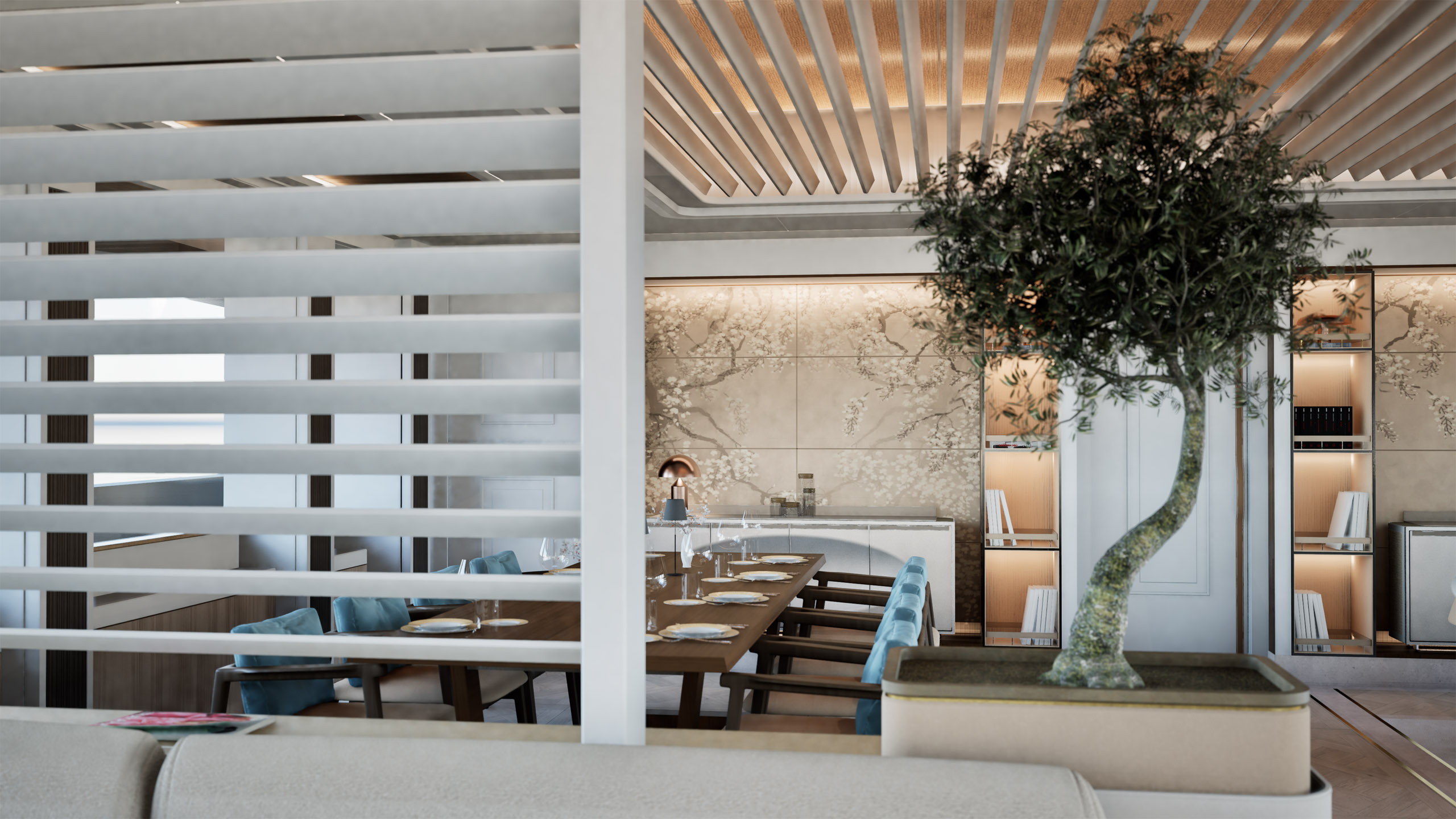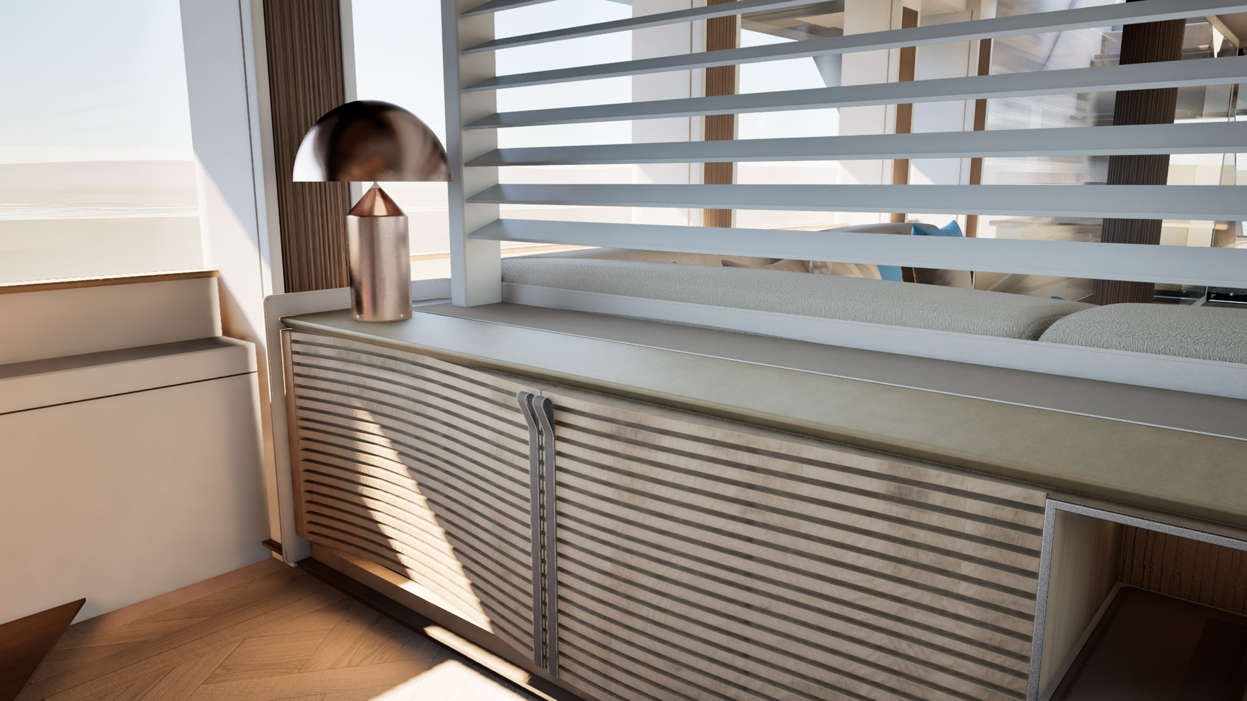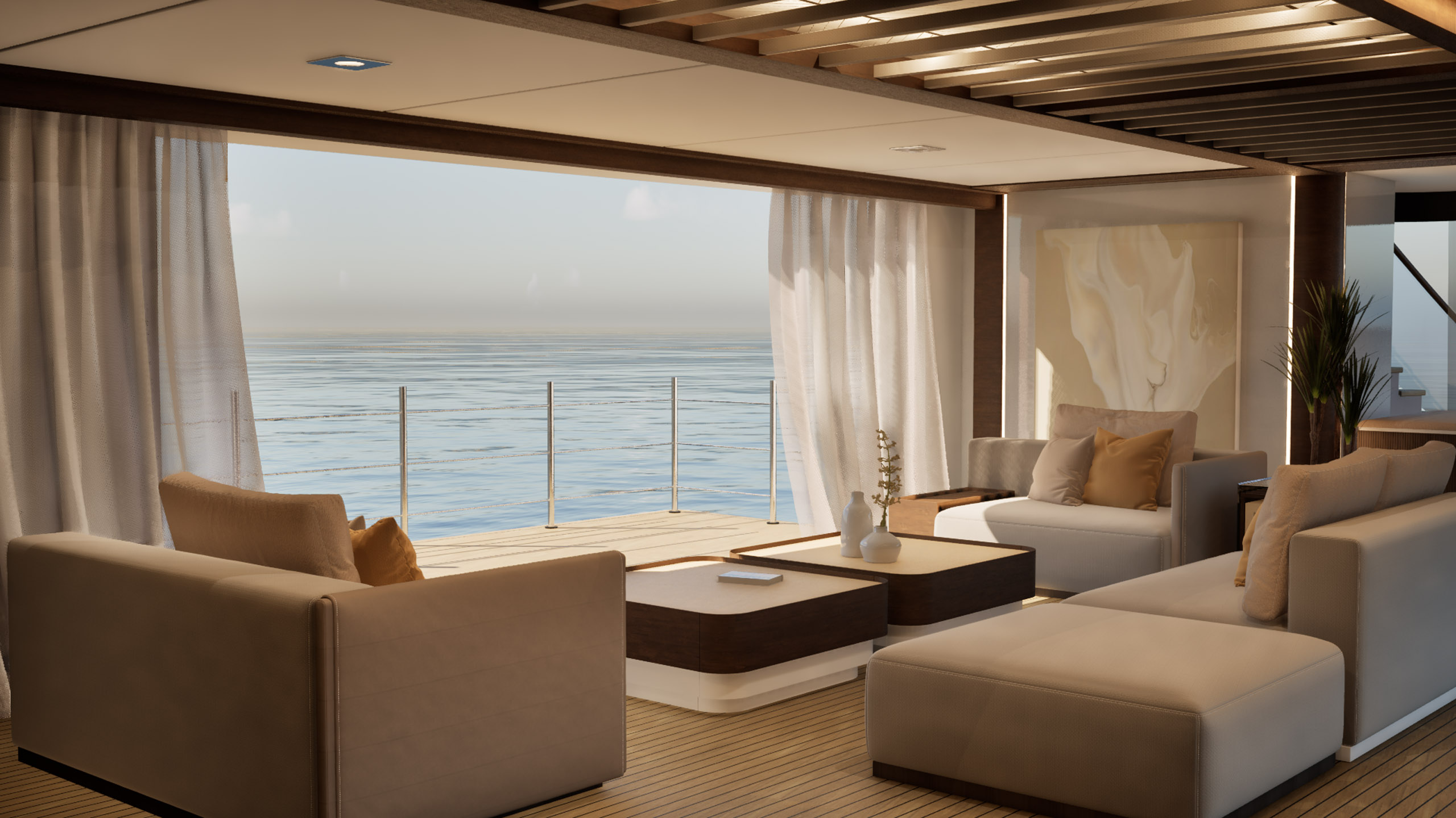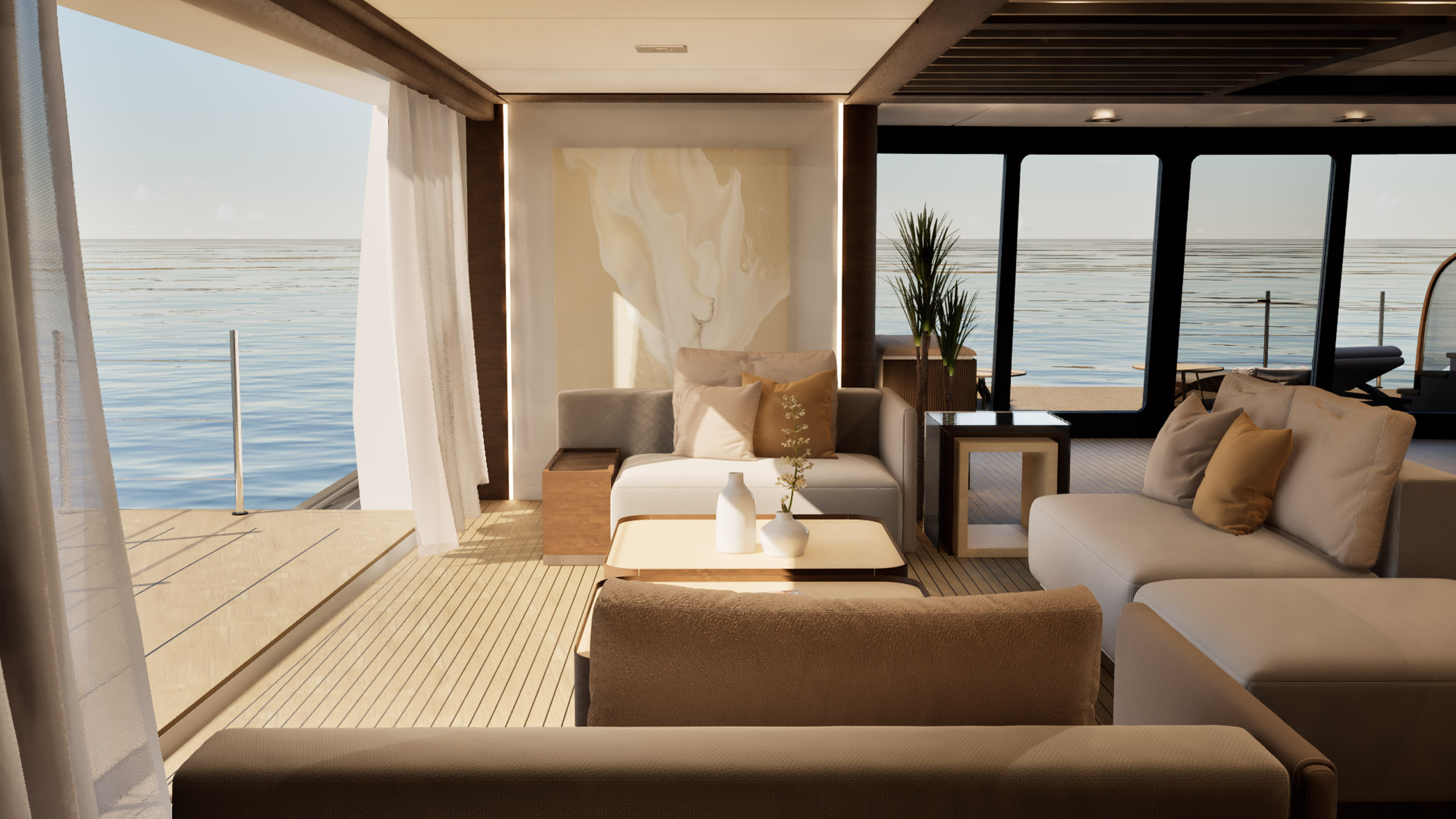 Drawing inspiration from Caribbean summer villas, the interior design explores the duality between raw and refined elements. The Caribbean villa aesthetic—with its generous openings, indoor-outdoor flow, and natural materials like weathered wood, sun-kissed stone, and salt-softened linen—presents a compelling challenge when translated to the maritime world.