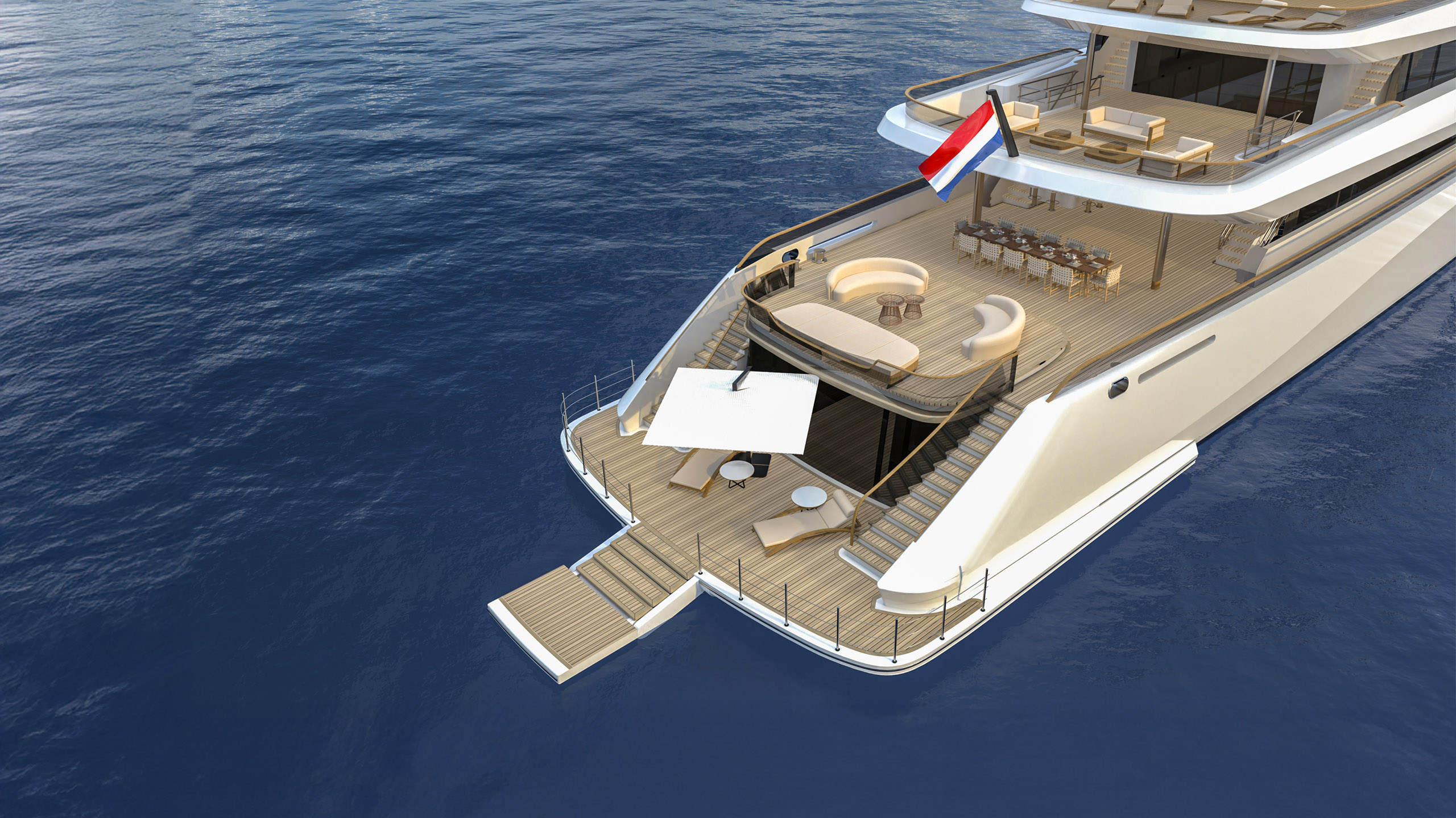 The top deck contains the wheelhouse and captain’s cabin alongside an aft sundeck area. A unique feature is the intimate observation deck positioned in front of the mast, complete with spa pool. The stern features a substantial beach club with glass doors opening onto a generous swim platform enhanced by a large transformer platform for optimal water access.